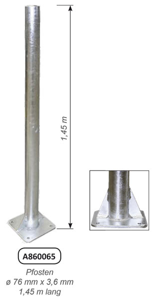 | A860065 | PFOSTEN, ø 76 mm x 3,6 mm, nackt 1,45 m lang, verzinkt, mit Bodenplatte 200 x 200 mm | Stck | 10,28 kg | 93,00 € | 110,67 € |