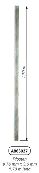| A863027 | PFOSTEN, ø 76 mm x 3,6 mm, nackt 1,70 m lang, verzinkt, zum Einbetonieren | Stck | 8,89 kg | 62,00 € | 73,78 € |