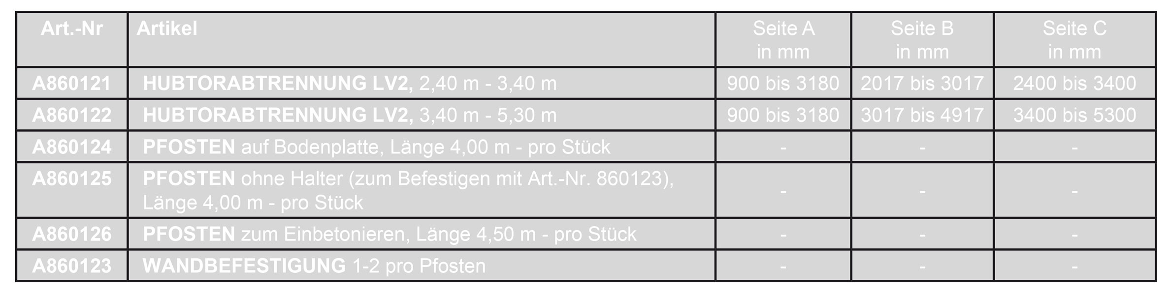 | A860121 | HUBTOR ABTRENNUNG LV2 (Teleskopierbar 2,40 m - 3,40 m) | Stck | 120,00 kg | 711,00 € | 846,09 € |